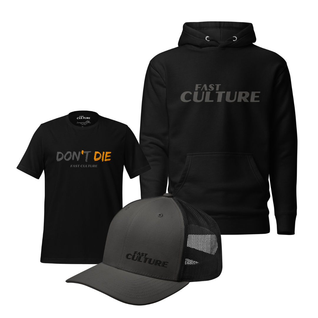 Fast Culture Hoodie, Don't Die T-Shirt and Trucker hat.